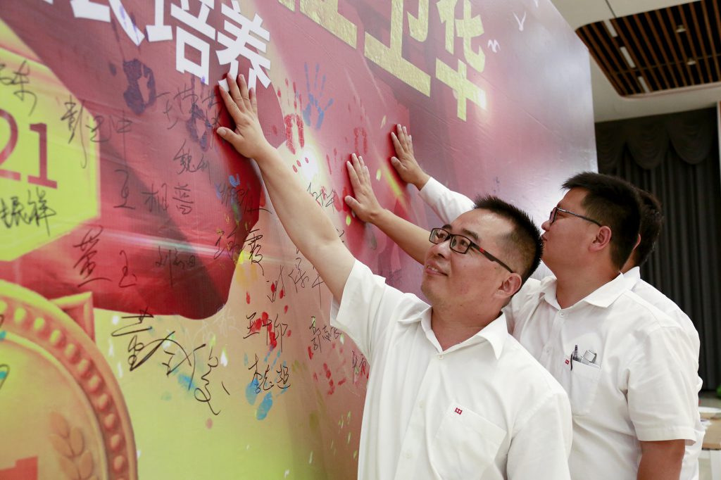 各位班组长学员在当初许下“学习先进管理知识,打造好体育全站官网登录金牌班组”铮铮誓言的签名墙上留下掌印,五彩斑斓的掌印天空,记录了他们一路成长的印记。
